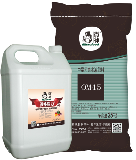 柑橘的品質,主要由三個因素決定,分別是果個、果色、口感。先說說果個,對于有些柑橘品種,比如說貢柑、沃柑,它都需要一定的果個,通常至少是70到80之間比較合適,因此當果個偏小時,現在天氣又比較干旱,我們可以沖一次水肥。沖水肥的時候,一定不要用高氮的配方。建議用微補調力,它主要由磷鉀組成,既調酸又補磷鉀,再加上微補OM45,補速效有機質,都能讓果個在增大的同時,還能讓糖分增加。
