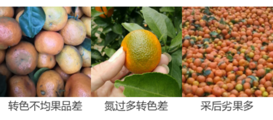 柑橘果小賣價(jià)低,色澤不好賣價(jià)也不高。柑橘著色要慎用著色劑!最好是不噴激素催熟,因?yàn)榧瓤赡軐?dǎo)致催熟過快的落果風(fēng)險(xiǎn),又可能有農(nóng)藥殘留風(fēng)險(xiǎn)。噴著色劑或含氮高的葉面肥,噴后果實(shí)色澤暗、著色不均勻、果軟、保鮮期短、口感差;果實(shí)留樹時(shí)間短,來不及采摘會(huì)大量產(chǎn)生落果、爛果,霜凍果,得不償失。