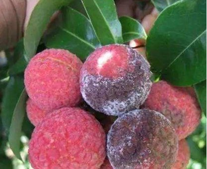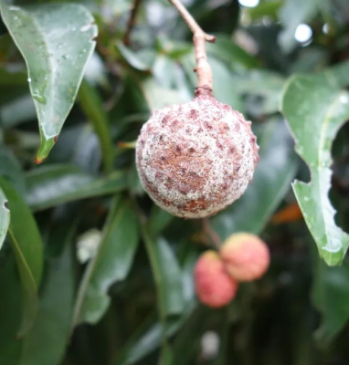 目前正值雨季,也是荔枝膨大-轉(zhuǎn)色期,雨后荔枝“殺手”——霜疫霉病大肆發(fā)生。荔枝果期霜疫霉病從果蒂開始發(fā)病,出現(xiàn)不規(guī)則的、無明顯邊緣的褐色病斑;近成熟果實(shí)感染,病菌擴(kuò)展蔓延迅速,致全果變褐腐爛。當(dāng)濕度較大時(shí),果實(shí)腐爛,流出褐色汁液并散發(fā)出刺鼻的酸味,表皮著生一層白色的霉層狀物。