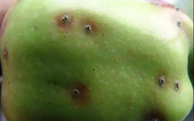 果實(shí)染病,在幼果果面上產(chǎn)生黑色發(fā)亮的小斑點(diǎn)或銹斑。病部有時(shí)呈灰褐色瘡痂狀斑塊,病健交界處有龜裂,病斑不剝離,僅限于病果表皮,但有時(shí)皮下淺層果肉可呈干腐狀木栓化。