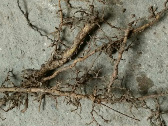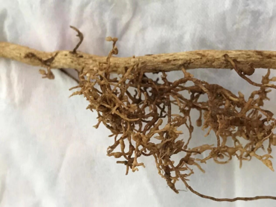 根結(jié)線蟲(chóng)為害柑橘根部,特別是側(cè)根、須根,造成根尖部位形成根瘤,根毛稀少,大小形狀不等,細(xì)根或側(cè)根明顯減少,初期根瘤為乳白色,后轉(zhuǎn)變成黑褐色;嚴(yán)重的時(shí)候須根扭曲并形成團(tuán)餅狀,最后壞死。