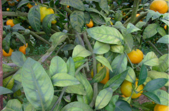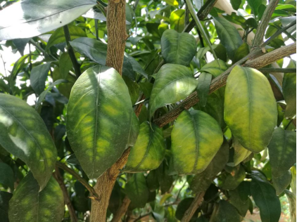 土壤肥力下降。多年生產(chǎn)的沃柑園,由于長(zhǎng)年的營(yíng)養(yǎng)輸出,土壤供給的養(yǎng)分逐年消耗,導(dǎo)致土壤肥力下降。再加上果農(nóng)一般都是偏施氮、磷、鉀肥等,而忽略了對(duì)土壤中的有機(jī)肥及中微量元素的補(bǔ)充,極易出現(xiàn)缺素黃化。有的沃柑園土壤保肥能力弱,雨水沖刷導(dǎo)致養(yǎng)分流失引起老葉黃化。