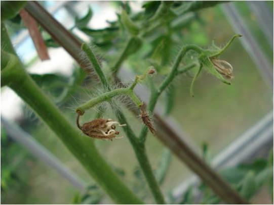 番茄是喜溫性蔬菜,開(kāi)花期最適溫度為25~28℃,若是越冬防寒措施不當(dāng)或者突遇降溫,花粉發(fā)育不良,受精不良而大量落花;另一方面冬茬番茄為保溫,通風(fēng)排濕做得少,棚內(nèi)空氣濕度相對(duì)高,花粉粒吸水而膨脹或因濕潤(rùn)環(huán)境不能從花囊中散出,影響授粉而脫落,即便來(lái)花多,落得多,則坐果低或者不坐果。