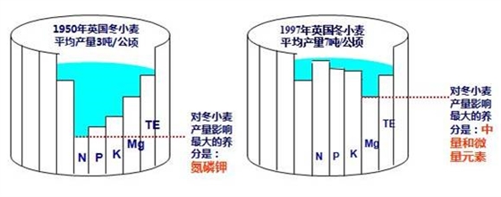 這下是不是清晰明了了?要增加作物產(chǎn)量,就要從最缺的元素來補充。以小麥為例,19世紀50年代,英國冬小麥的平均產(chǎn)量是3噸/公頃,經(jīng)過研究發(fā)現(xiàn),對產(chǎn)量影響最大的養(yǎng)分是氮磷鉀,于是農(nóng)民開始大量施用氮磷鉀復合肥,產(chǎn)量開始逐步增加。到了19世紀末的1997年,英國冬小麥的平均產(chǎn)量可以達到7噸/公頃,而這個時候發(fā)現(xiàn)再加大氮磷鉀的施用量,產(chǎn)量也不增加了,反而開始減少。后來發(fā)現(xiàn)經(jīng)過幾十年的補充,氮磷鉀已經(jīng)完全不缺乏了,反而是缺乏中量和微量元素,比如鈣鎂硼鋅鐵銅等。
