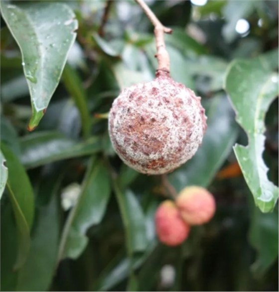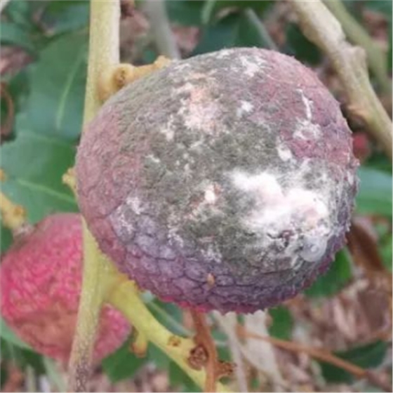 目前正值雨季,也是荔枝膨大-轉色期,雨后荔枝“殺手”——霜疫霉病大肆發(fā)生。荔枝果期霜疫霉病從果蒂開始發(fā)病,出現(xiàn)不規(guī)則的、無明顯邊緣的褐色病斑;近成熟果實感染,病菌擴展蔓延迅速,致全果變褐腐爛。當濕度較大時,果實腐爛,流出褐色汁液并散發(fā)出刺鼻的酸味,表皮著生一層白色的霉層狀物。